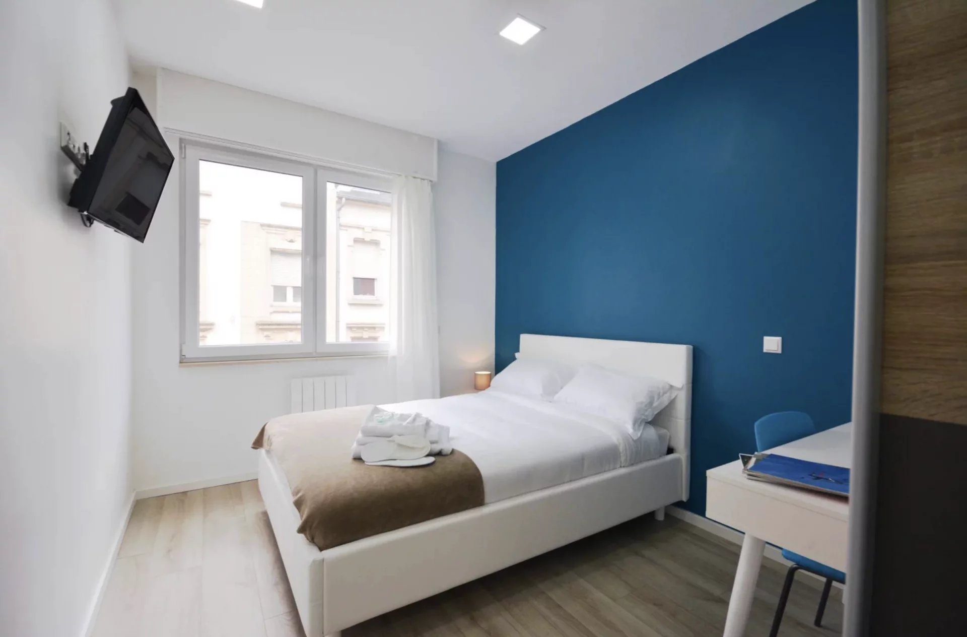 Jolie chambre avec un lit double, un bureau avec sa chaise et une grande armoire.